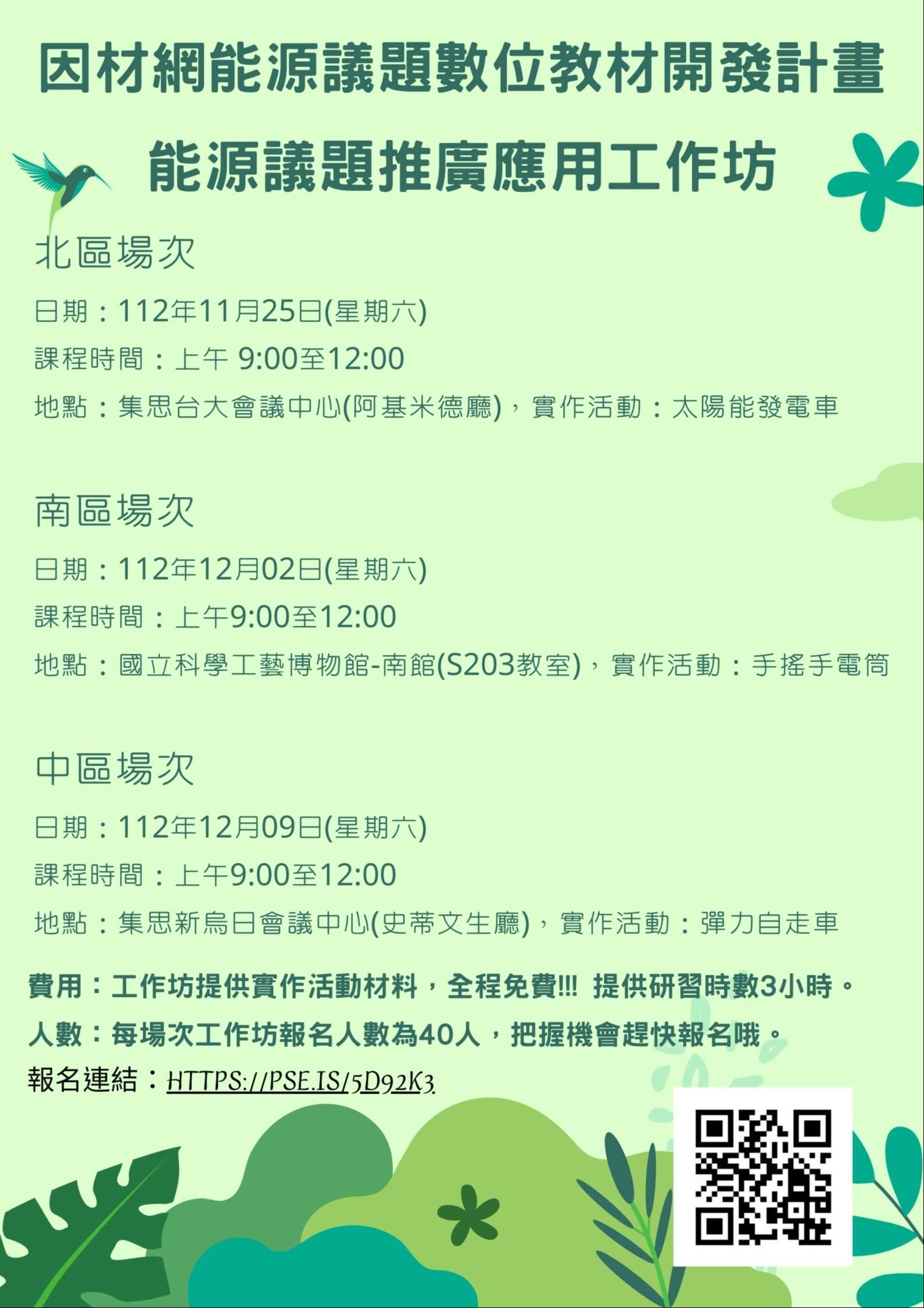 報名資訊:每場次工作坊報名人數上限為40人,請把握時 間報名
