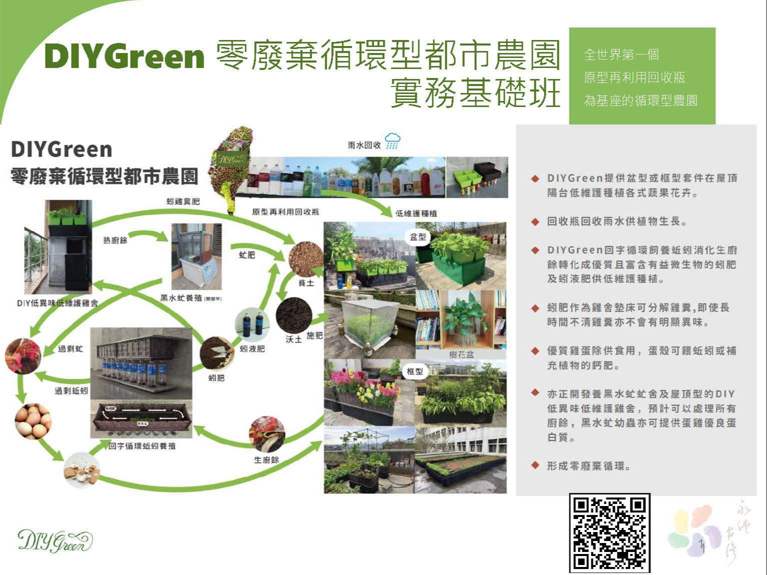 DIYGreen 循環型都市農園是全世界第一個以回收瓶為基座 的 DIY 循環型農園。可在水泥地上創造出綠地供種蔬果花 卉,適合從小孩至長者所有年齡層DIY施作;有關DIYGreen 單盆體驗班及DIYGreen盆型基礎班兩門課程,詳細課程訊 息及報名請至https://reurl.cc/krrY6n,檢附課程DM一 份。
