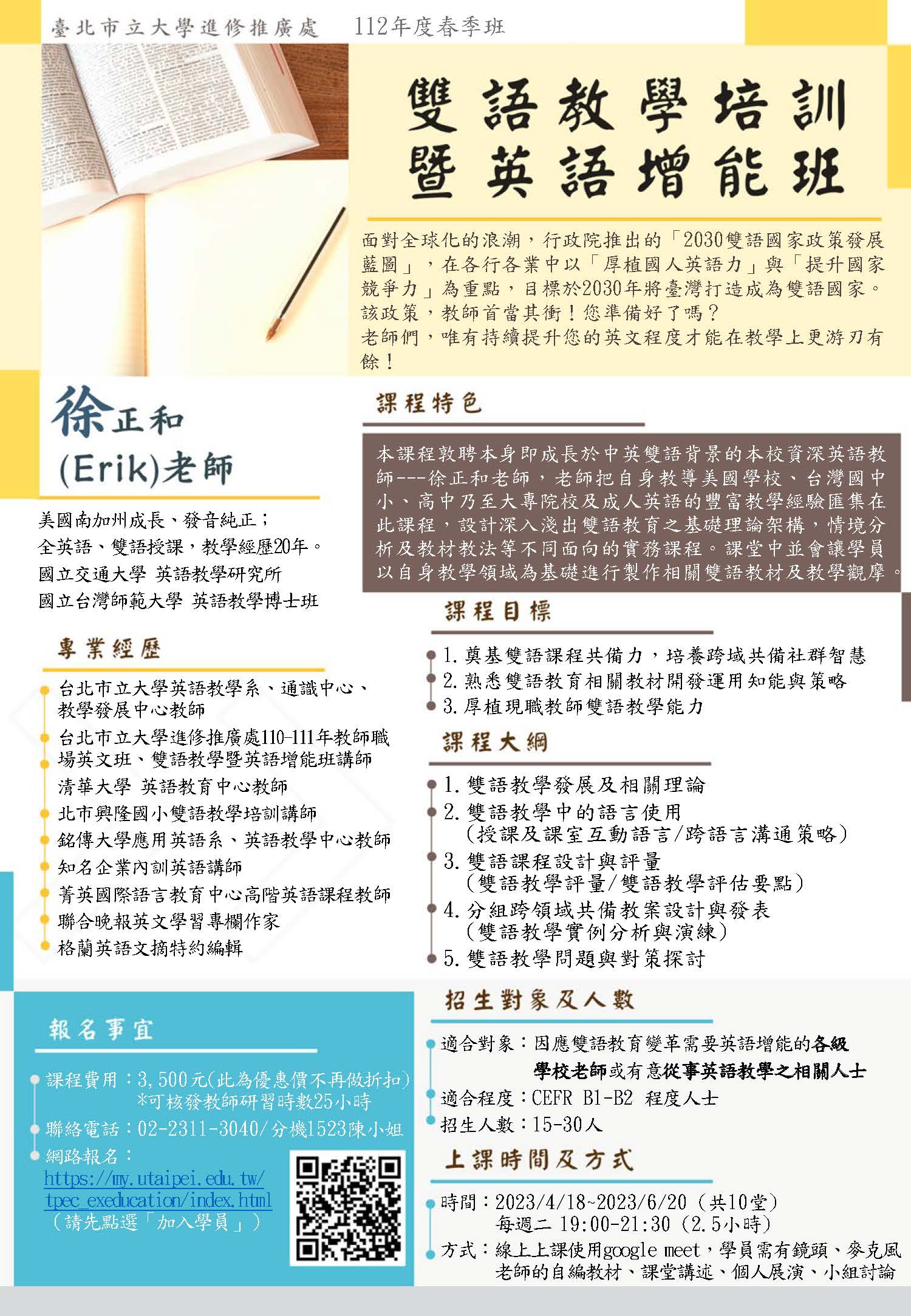 臺北市立大學將舉辦線上雙語教學培訓暨英語增能班,詳情請見附檔海報,謝謝大家!