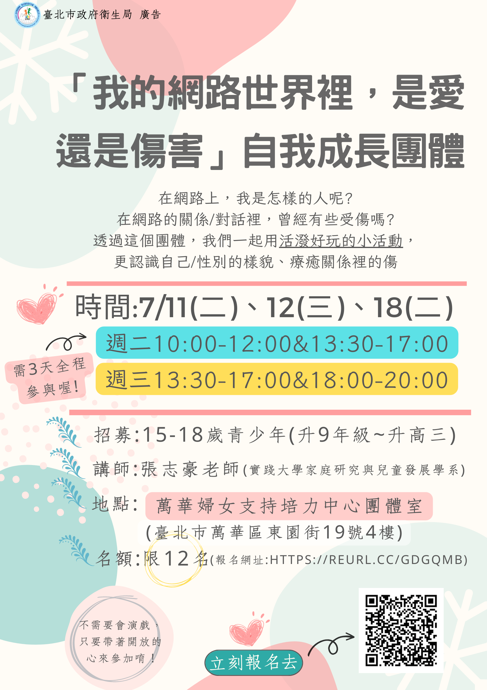 衛生局訂於112年7月11日、12日及18日辦理1梯次(3日) 團體,招募升9年級至升高三(15至18歲)青少年12名。