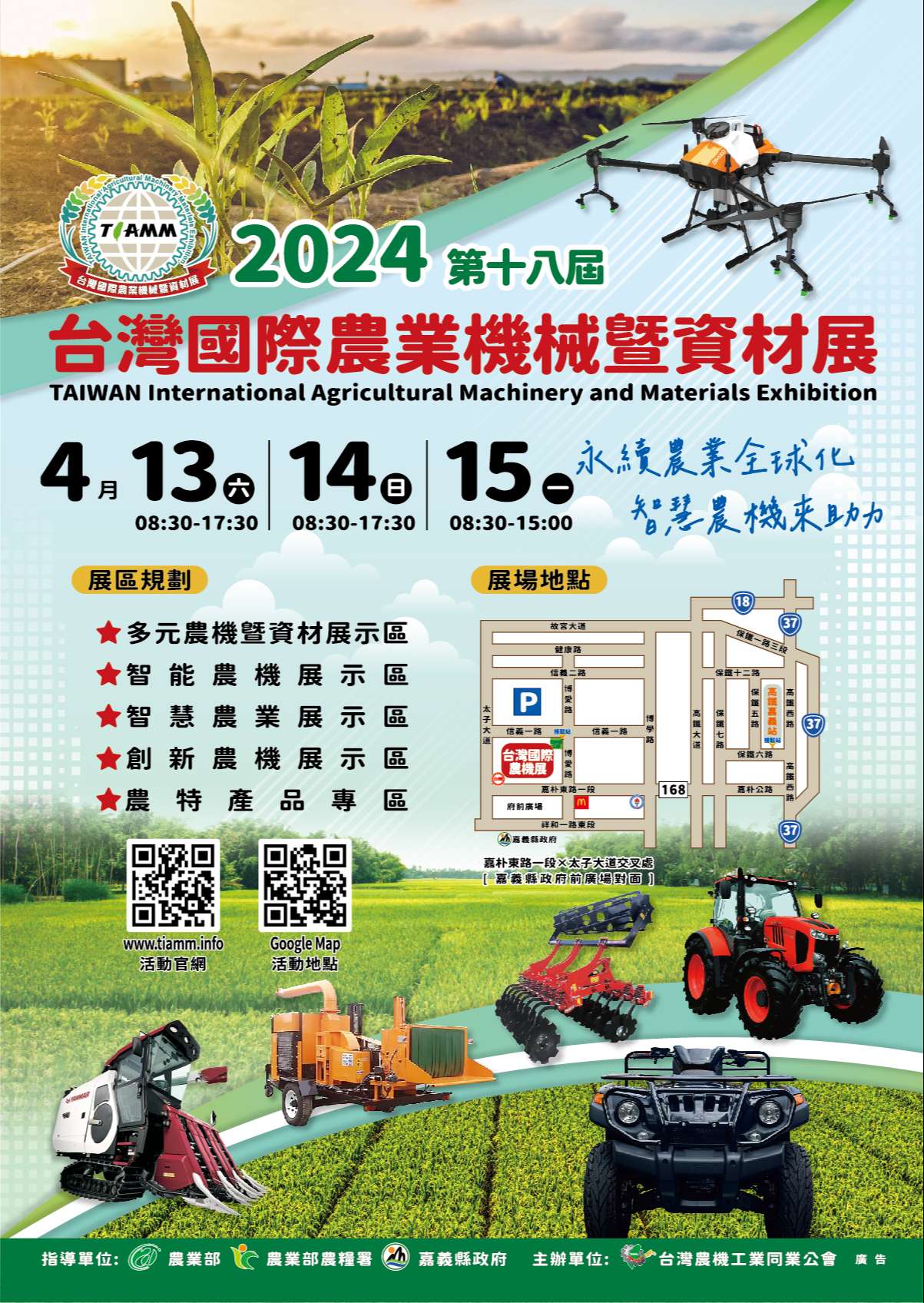活動內容:展出智慧農業展示區、智能農機展示區、創新 農機展示區、多元農機暨資材展示區及農特產品展示區。