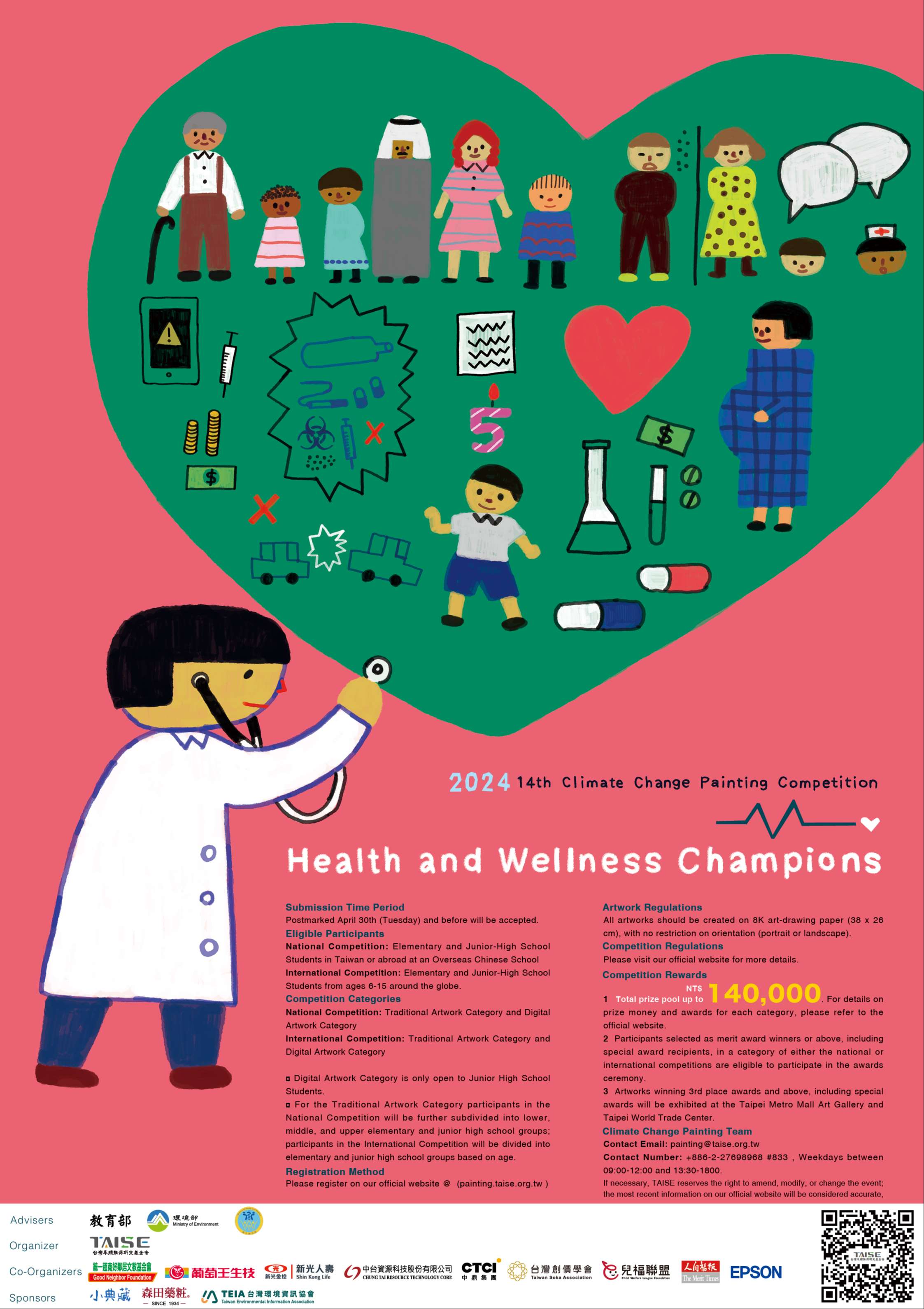 第14屆為呼應聯合國永續發展目標(SDGs)第3項「健康與 福祉」,以「健康小大使」為主題,提升師生對傳染病的 認知並共同探討如何預防傳染疾病;同時學習健康的生活 方式、情緒管理等等,亦須充分了解各項子目標的內容, 攜手邁向健康、平安生活。此繪畫比賽也呼應第13項,採 取氣候行動並提升大眾相關意識。