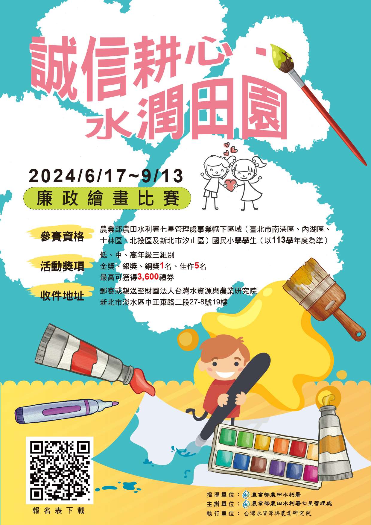 「誠信耕心‧水潤田園」廉政繪畫比賽將於6月17日正式開展!這是一個讓孩子展現創意與繪畫才華的絕佳機會。本繪畫比賽藉由藝術形式,鼓勵孩子發揮創造力,表達其內心對於誠信與農田水利設施的想像,並在構思、彩繪的過程中更加認識其觀念與價值。