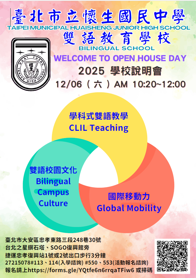 一、本校於109學年度升格為雙語課程學校,辦理校園開放參觀 日(Open House Day),提供國小應屆畢業生及家長,了解 本校辦學理念、各項特色課程及學校教學環境。